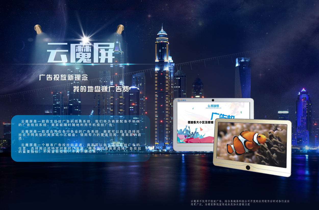 易城易云魔屏+是互聯網+傳媒+智能硬件與軟件的科技。專注打造“互動媒體+廣告”的新媒體平臺,以做為應用場景,增加商家的宣傳價值、開創(chuàng)互聯網互動媒體新局面。